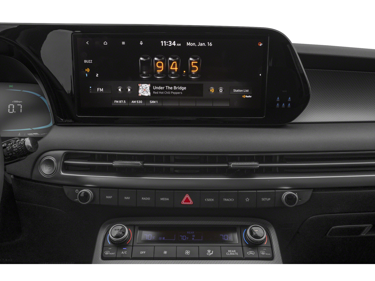 - Radio: AM/FM/MP3 Audio System -inc: 12.3" color touchscreen display, onboard navigation w/traffic flow including incident data via HD Radio (HERE), Over-the-Air (OTA) map updates, SiriusXM, USB, Android Auto and Apple CarPlay, rear seat quiet mode, Bluetooth® hands-free connectivity w/multiple device connection and wireless audio streaming, Wifi hotspot, dynamic voice recognition and Bluelink Connected Car System